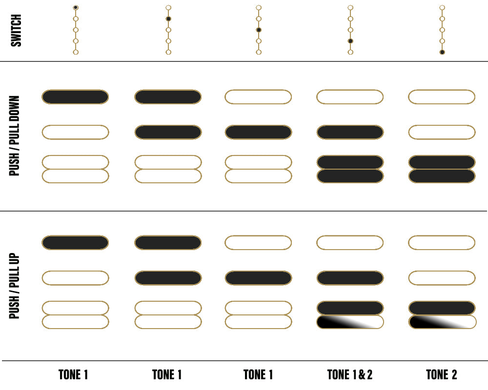 Der zweite Tonregler dient zur Aufteilung der Humbucker-Spulen. Mit dem Regler „Voice“ für die Spulenaufteilung kann der gewünschte Aufteilungsgrad eingestellt werden.