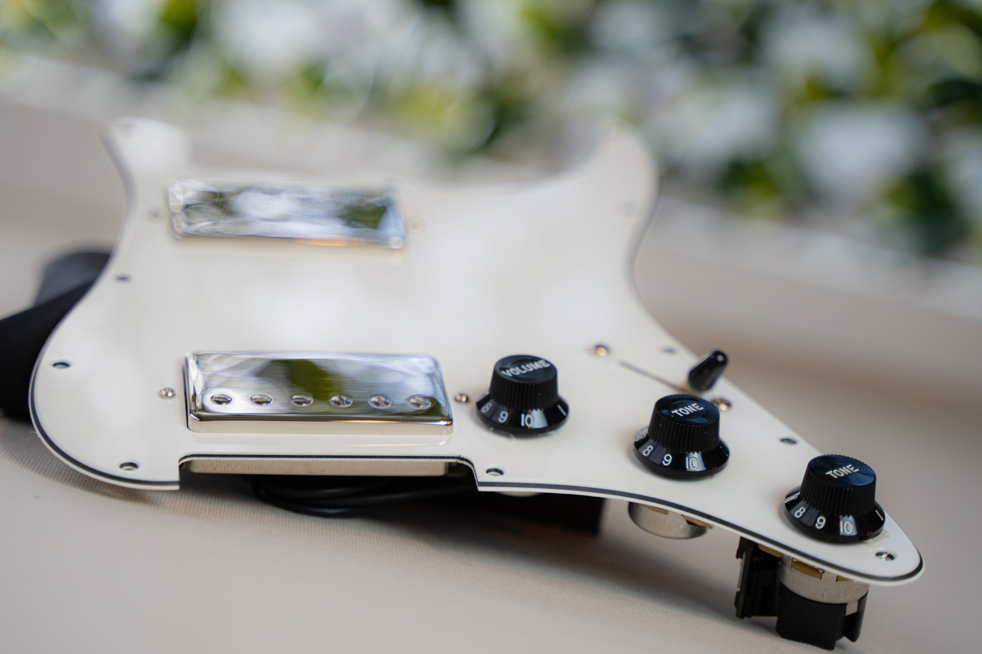 • ObsidianWire 3 Ply black loaded HSS pickguard with parchment white pickup covers, and parchment white knobs